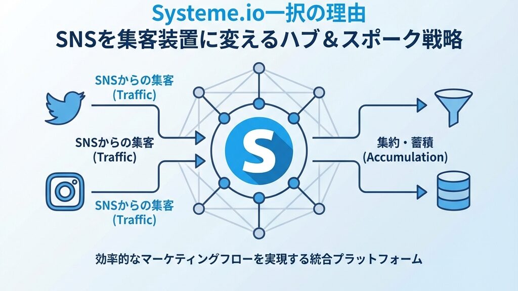 SNSは「集客装置(Traffic Source)」として使い、そこで興味を持ってくれた人を、安全な「自社リスト(Systeme.io)」に移動させる。
