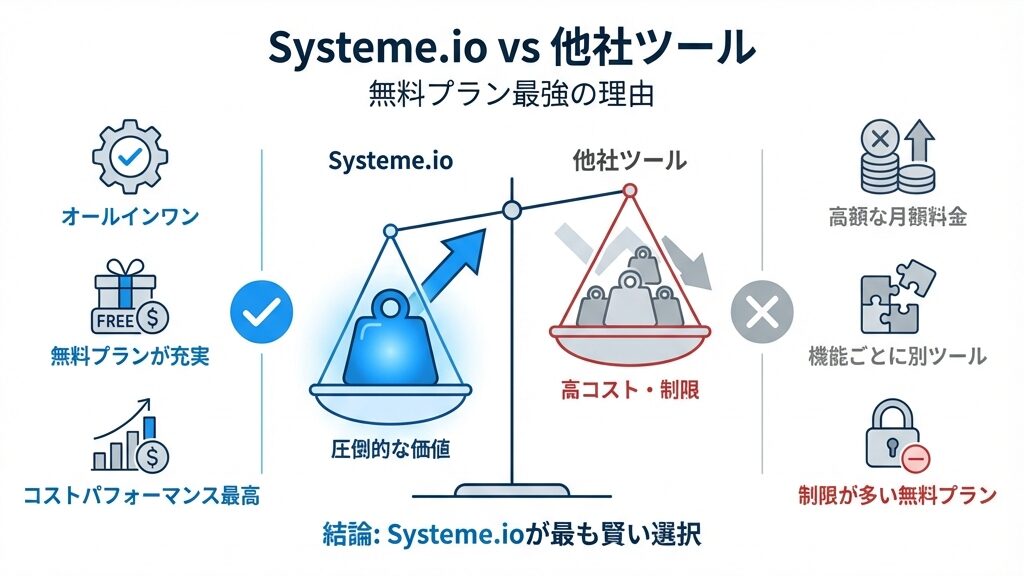 そう思いますよね。でも、これからビジネスとして商品を売ったり、長く続けたいと思っているなら、実はSysteme.io一択なんです。その理由を、他のツールと比較しながらお話ししますね。